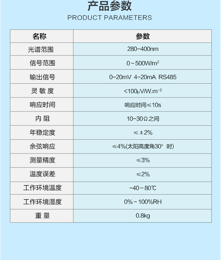 TBQ-UVAB紫外輻射傳感器用于測量和記錄環(huán)境中280-400nm的紫外輻射強度的一款高性能的環(huán)境監(jiān)測設(shè)備。產(chǎn)品特點在于其高精度、快速響應(yīng)和穩(wěn)定性強,能夠準(zhǔn)確捕捉并反映紫外輻射的變化情況。無論是在氣象觀測、環(huán)境監(jiān)測、皮膚健康研究還是戶外工作場所的安全評估中,紫外輻射表都發(fā)揮著至關(guān)重要的作用。它能夠幫助我們更好地了解紫外輻射對環(huán)境及人體健康的影響,為相關(guān)領(lǐng)域的科研、政策制定及安全預(yù)警提供有力支持。